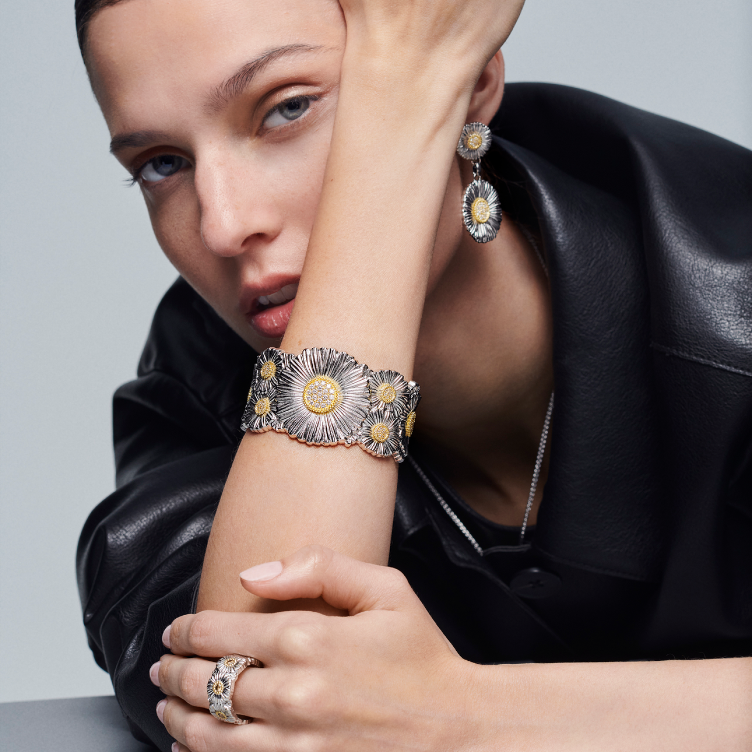 Blossoms系列通过富有朝气的贵金属银切割造型,以及精湛的凿刻工艺和金色元素、钻石及彩石点缀,充分诠释了Buccellati布契拉提的独特风格。对设计、工艺和品质的执着追求,是彰显卓越标准的作品的代名词。
