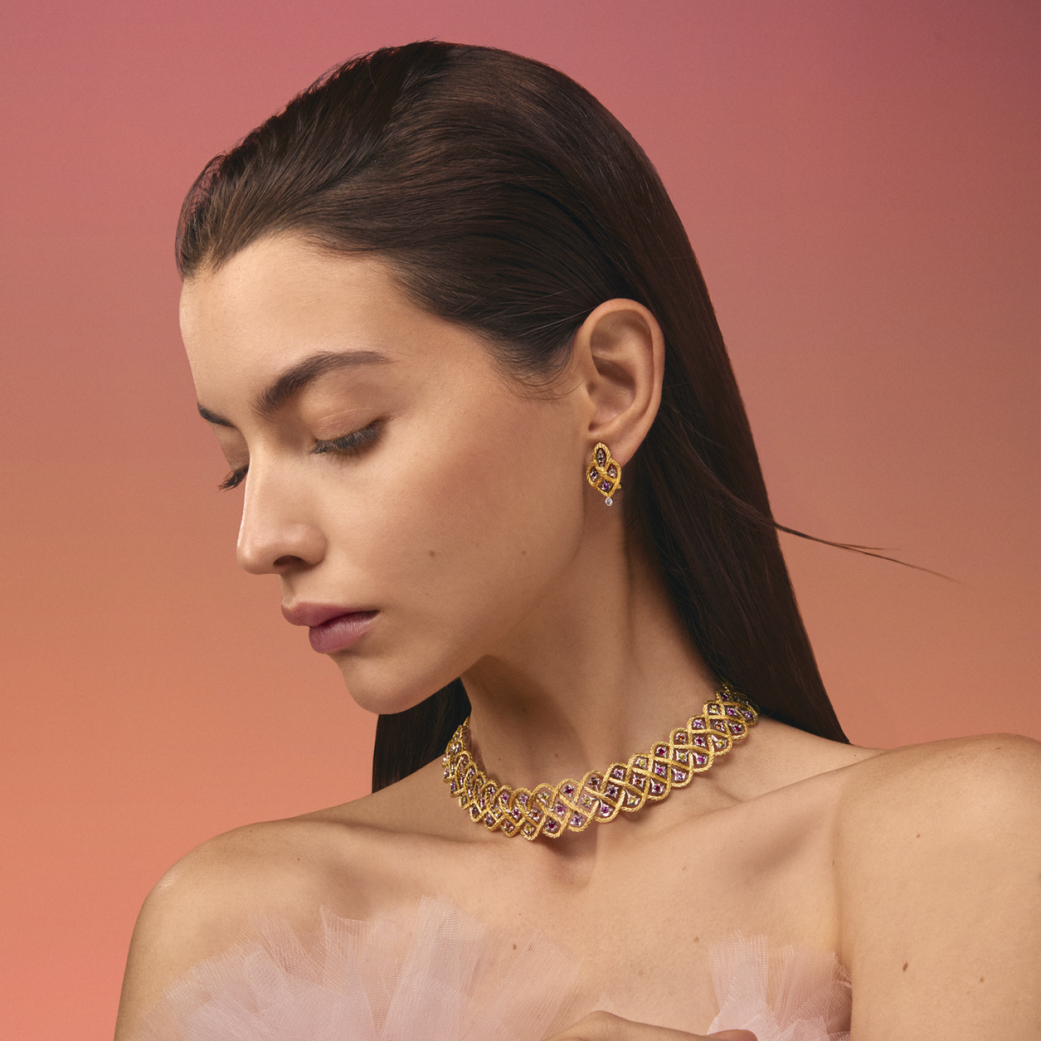 Étoilée Color系列重新诠释品牌第三代传承人Andrea Buccellati先生标志性的手工雕刻工艺,以彩色宝石取代传统钻石镶嵌。红宝石和锰铝榴石的炽热光芒邂逅蓝宝石和沙弗莱石的宁静清爽,冷暖色调交织共舞,演绎光影流转间的静谧平衡。
