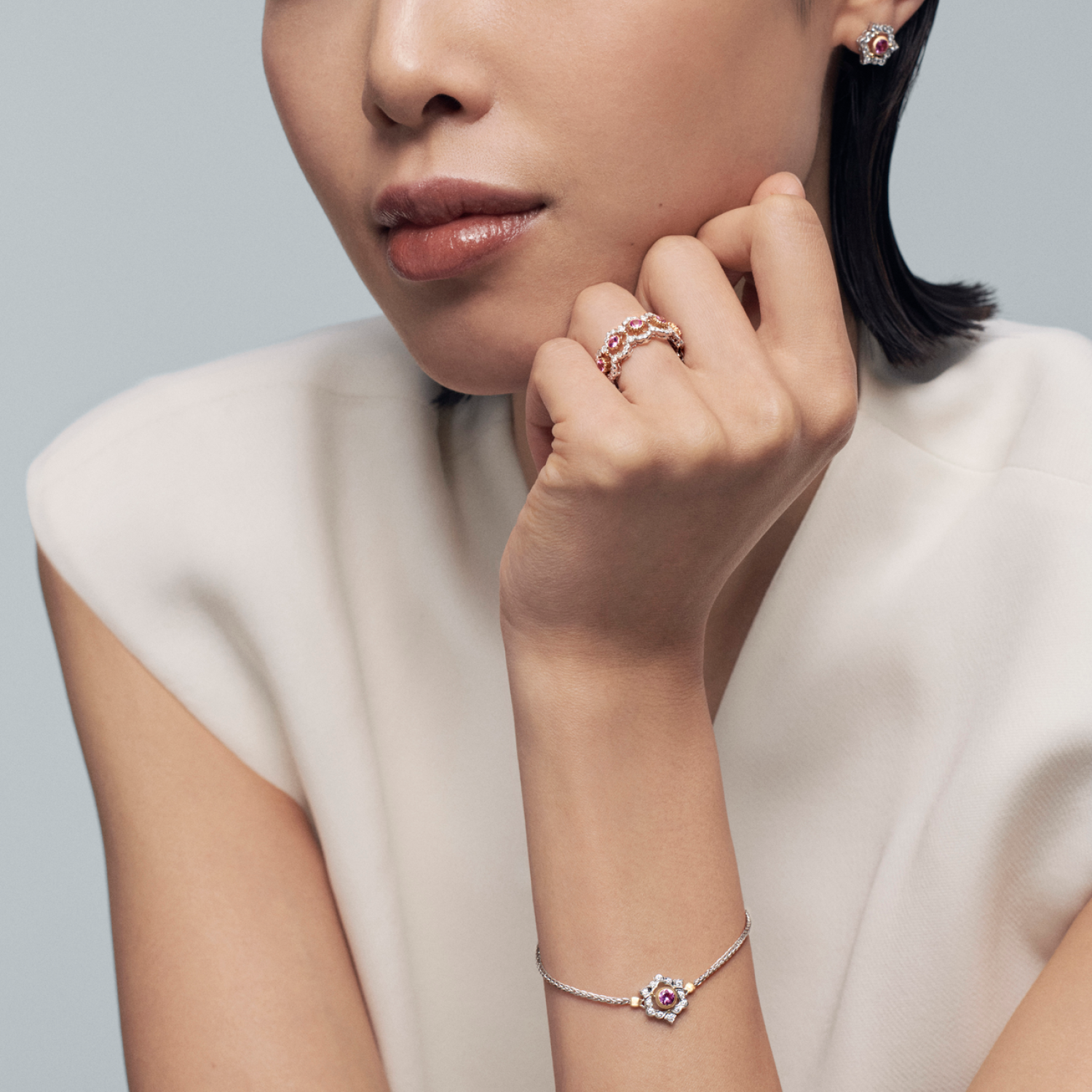 Ghirlanda系列以全新面貌,在当代设计语境下演绎多元风格。色彩缤纷的宝石取代钻石,迸发鲜活生机。瑰丽宝石在标志性的花环图案中优雅绽放,精湛的“traforo”雕刻工艺则赋予珠宝整体以轻盈通透的质感。色彩与匠心在此相融,既彰显独特个性,亦流露恒久典雅。