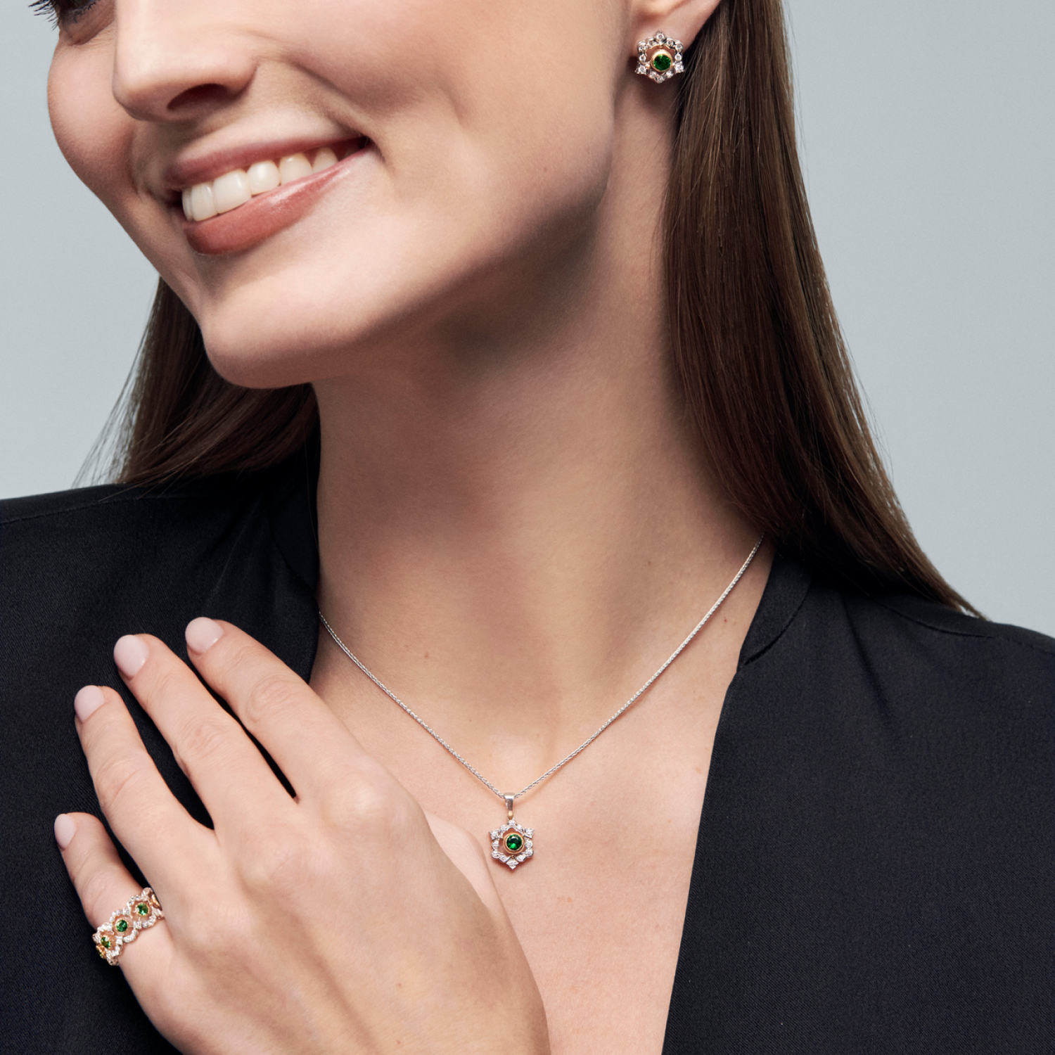 Ghirlanda系列以全新面貌,在当代设计语境下演绎多元风格。色彩缤纷的宝石取代钻石,迸发鲜活生机。瑰丽宝石在标志性的花环图案中优雅绽放,精湛的“traforo”雕刻工艺则赋予珠宝整体以轻盈通透的质感。色彩与匠心在此相融,既彰显独特个性,亦流露恒久典雅。