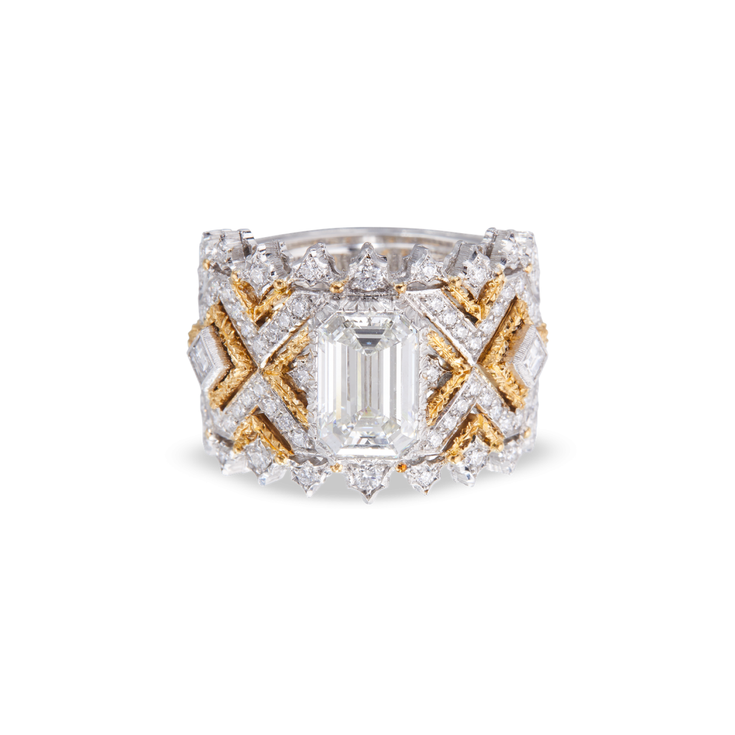 镂空戒指,点缀白金装饰,镶嵌精致美钻,润饰黄金造型。八角形中央底座镶嵌精致方形切割钻石。边缘由白金镶钻饰件组成。