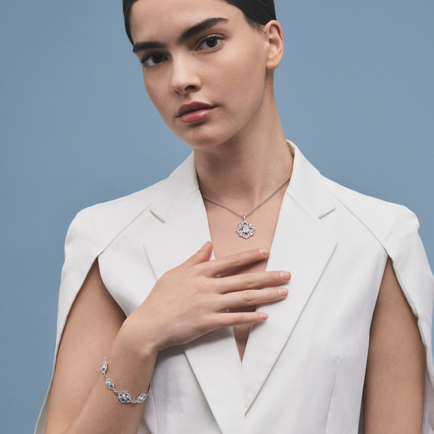 白金镶钻柔性手链。请注意,图案的数量可能因订购产品的尺寸而异. 大号标志图案尺寸:1.63 x 1.45厘米。小号标志图案尺寸:1.43 x 1.26厘米。
