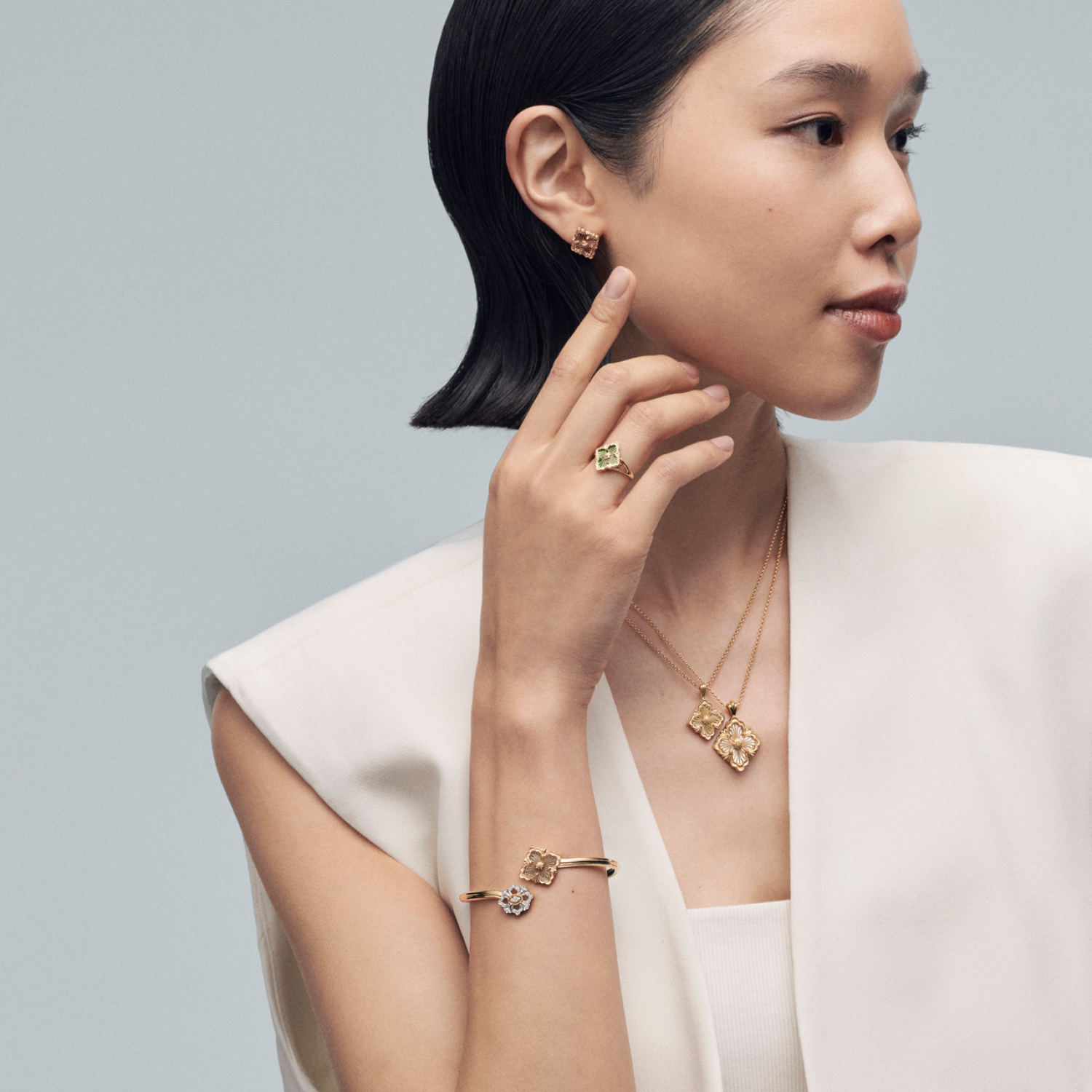 布契拉提的标志性Opera系列选取了Maison标志元素,并将这一设计贯穿于每款珠宝之中。珠宝设计精美迷人,设计创意千变万化,完美地将传统的古代金饰工术与其设计的原创性和美感融为一体。尤其是薄纱装饰,是布契拉提许多创意作品的显著特征之一。Opera系列产品在精致风格基础上融入了彩色宝石或珐琅元素,为珠宝饰品增添了标志性触感,这些珠宝饰品没有附加任何镶嵌装饰,直接呈现了自身形状之美感。Opera系列产品外观精美,彰显出独特的个性和独具一格的品味,每件布契拉提作品能都增加佩戴者的优雅气派和女性高贵气质。