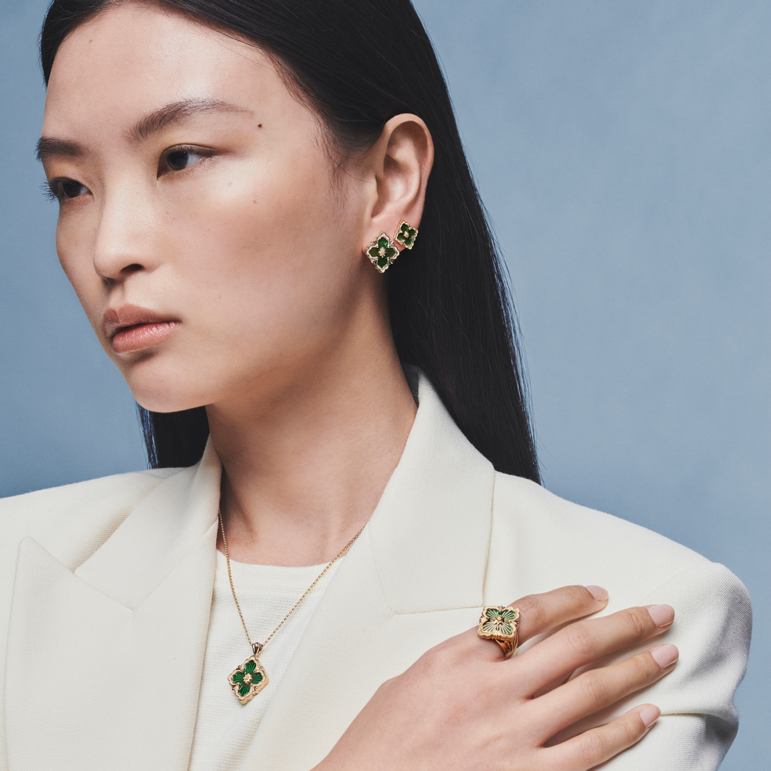 布契拉提的标志性Opera系列选取了Maison标志元素,并将这一设计贯穿于每款珠宝之中。珠宝设计精美迷人,设计创意千变万化,完美地将传统的古代金饰工术与其设计的原创性和美感融为一体。尤其是薄纱装饰,是布契拉提许多创意作品的显著特征之一。Opera系列产品在精致风格基础上融入了彩色宝石或珐琅元素,为珠宝饰品增添了标志性触感,这些珠宝饰品没有附加任何镶嵌装饰,直接呈现了自身形状之美感。Opera系列产品外观精美,彰显出独特的个性和独具一格的品味,每件布契拉提作品能都增加佩戴者的优雅气派和女性高贵气质。