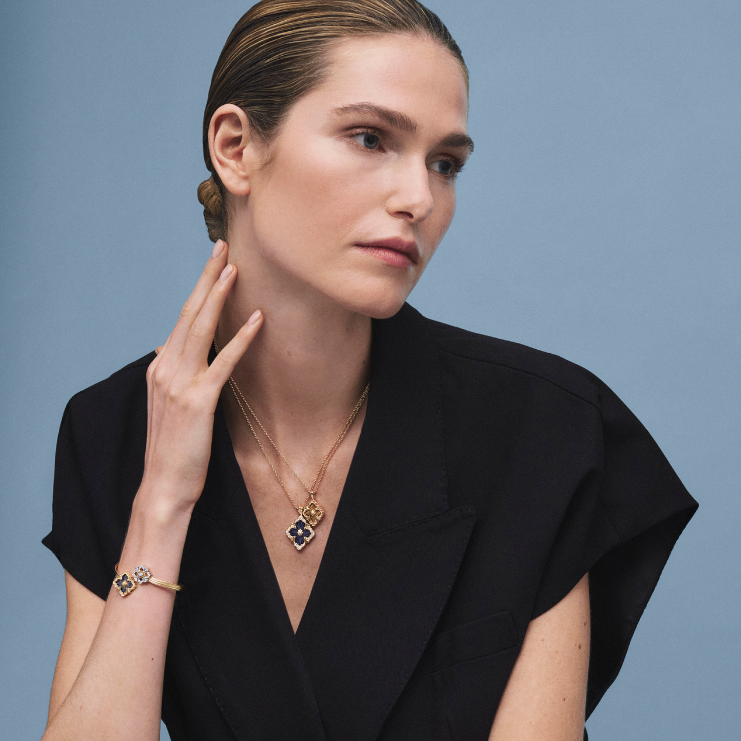Opera Tulle吊坠由黄金徽标元素组成,饰有辐射状tulle,中央嵌入黄金玫瑰花环。边缘呈扇形,吊坠链子为黄金材质。