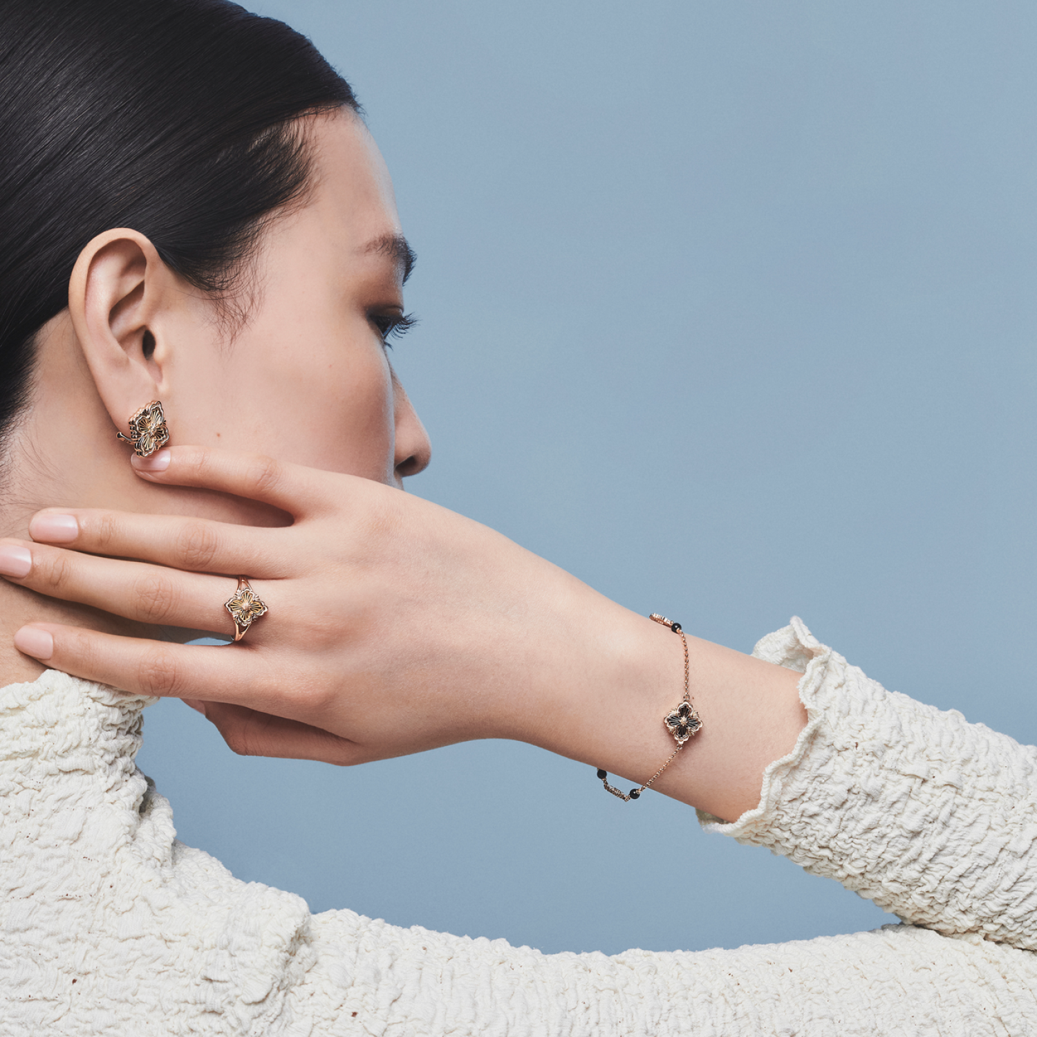 布契拉提的标志性Opera系列选取了Maison标志元素,并将这一设计贯穿于每款珠宝之中。珠宝设计精美迷人,设计创意千变万化,完美地将传统的古代金饰工术与其设计的原创性和美感融为一体。尤其是薄纱装饰,是布契拉提许多创意作品的显著特征之一。Opera系列产品在精致风格基础上融入了彩色宝石或珐琅元素,为珠宝饰品增添了标志性触感,这些珠宝饰品没有附加任何镶嵌装饰,直接呈现了自身形状之美感。Opera系列产品外观精美,彰显出独特的个性和独具一格的品味,每件布契拉提作品能都增加佩戴者的优雅气派和女性高贵气质。