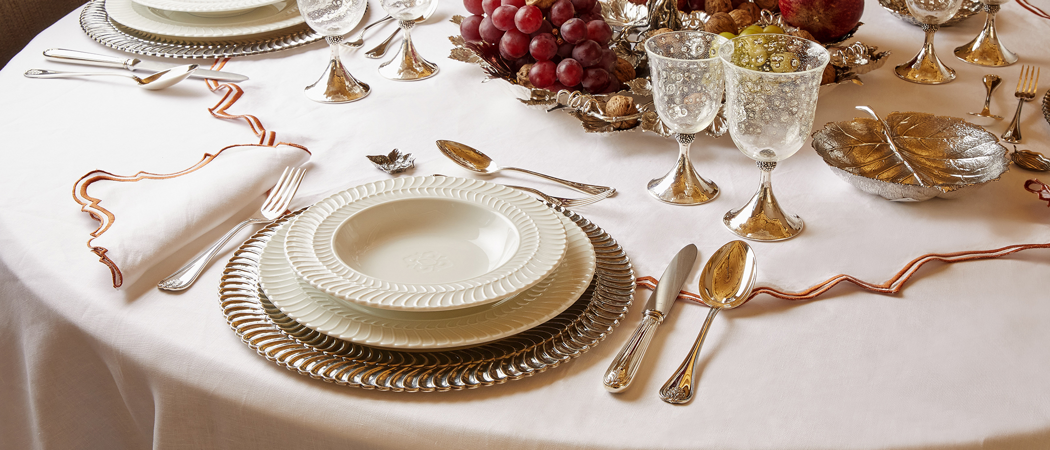 精美餐具绘染温暖色调,尽显新季绚烂之美。即刻探索Nature系列,银质树叶和餐桌中央摆饰夺目耀眼,生动捕捉了秋日神韵,可为您的派对注入自然雅趣。