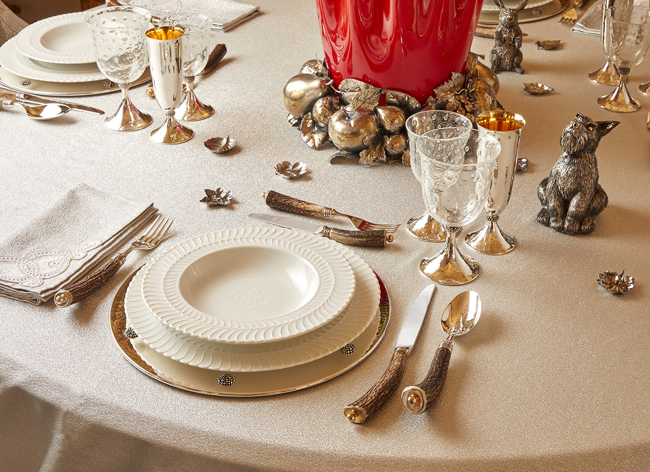 巧用Buccellati迷人的物件布置餐桌,见证今季难以忘怀的时刻。探索Cervino系列精美的餐具,银质部件流露熠熠莹泽,与角质装饰相互映衬。Furry系列的银质动物憨态可掬,别有一番灵动趣味。