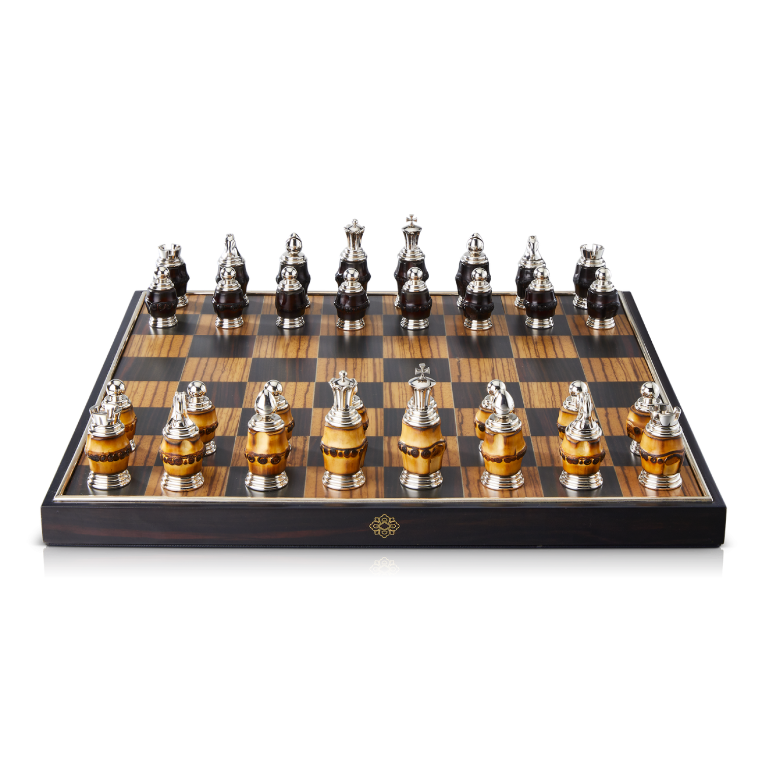 游戏用品 银. 一套 16 个竹木棋子、16 个黑檀木色竹木棋子、带银色细节的棋盘和棋盒。