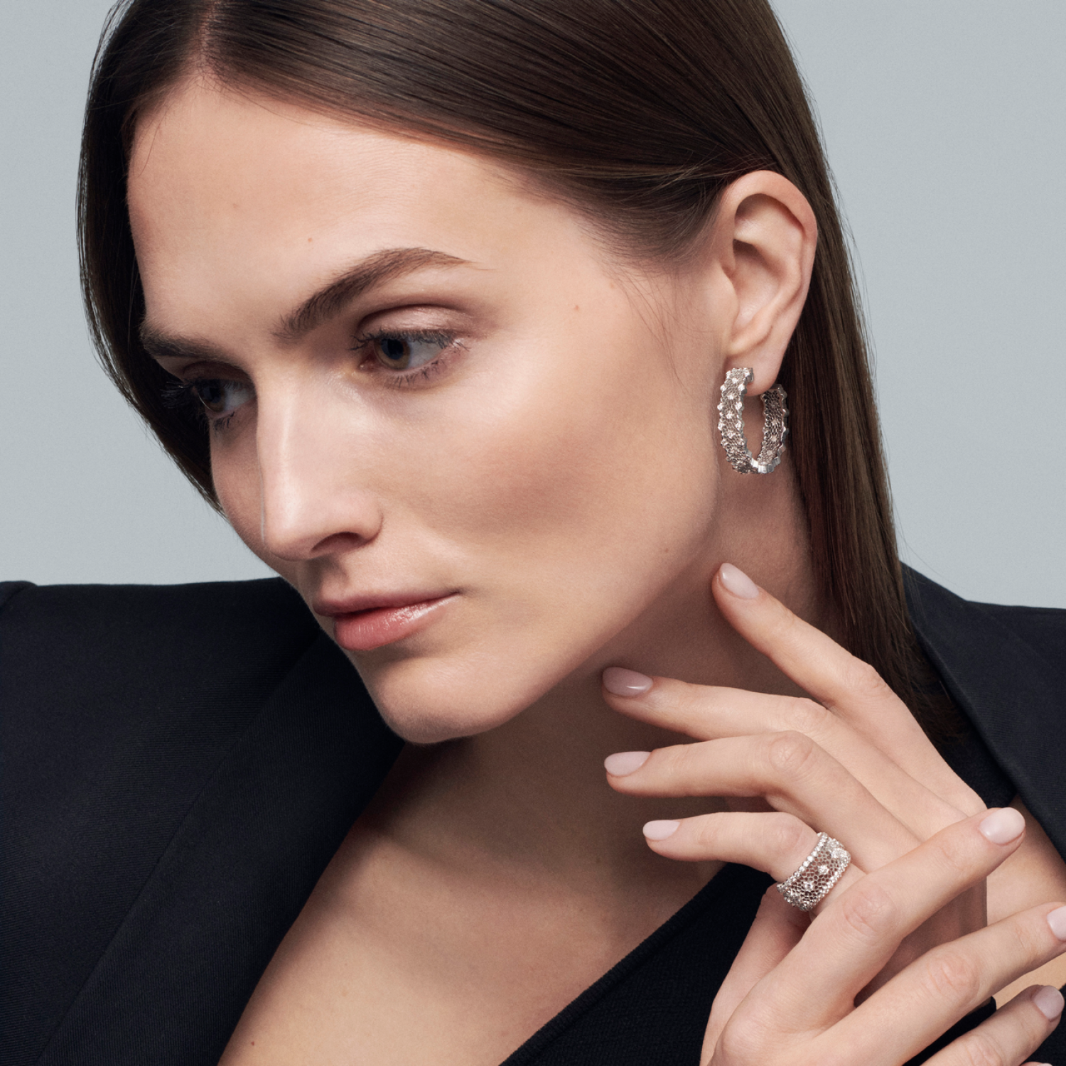 这种风格亦称为“Tulle”,是最复杂的高级珠宝工艺之一。金匠用近一个月时间,才能手工雕琢出一块半毫米金饰板,并微雕出镂空六边形花饰。宝石悬浮于若有似无的蜂巢镂空结构之上,该设计一经推出,广受推崇。